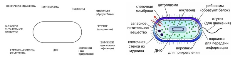 Бактерия, как любая клетка, покрыта клеточной мембраной, поверх клеточной мембраны располагается особая защитная оболочка – клеточная стенка, которая сделана из особого вещества – муреина. Жидкая часть клетки носит название цитоплазмы, у бактерий нет ядра, вместо него есть сгусток цитоплазмы, в котором находится молекула, несущая информацию – молекула ДНК, и называется нуклеоид, переводится как «подобный ядру». Каждый организм вырабатывает белок, бактерии не исключение, у них тоже есть части, вырабатывающие белок, и называются они рибосомы, они распределены по всей клетке. Жгутик бактерии необходим для движения, но не все бактерии обладают жгутиком, не все они способны к передвижению. Не все бактерии имеют и особые ворсинки, которых существует два вида: одними бактерия прикрепляется к необходимым поверхностям, другие служат для передачи информации между бактериями. Внутри бактерии находится запасное питательное вещество. И клеточная оболочка, и клеточная мембрана проницаемы для веществ, которые необходимы бактерии для жизнедеятельности, в первую очередь, для питания. При образовании вредных веществ для бактерии они удаляются также через оболочку и мембрану, так происходит обмен веществ у бактерий.