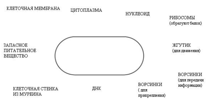 Учитель: Нашему чемпиону мы напишем портрет под названием «Строение бактерии» и дадим названия органоидам бактерий( рисунок на доске).