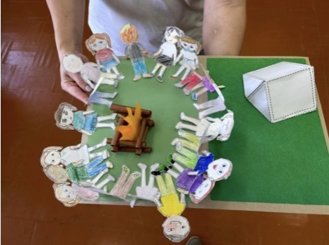 Я предлагаю всем вместе создать макет нашей дружной компании (ребята раскрашивают человечков, а родители готовят макет костра, палатки). Тем временем учитель размещает в центре учебной комнаты макет костра (можно добавить гирлянду, создавая уют; свет выключается).