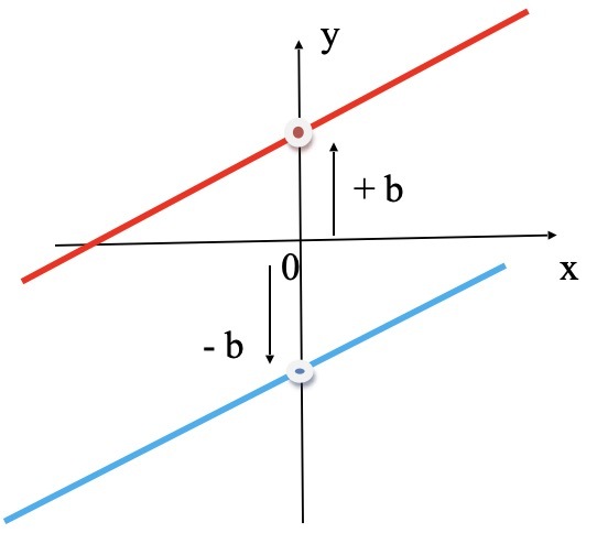 Далее функция y=kx+b. Здесь добавляется значение b. Для этого элемента использую «ассоциации». Буква b выступает как первая буква слов - Вверх и Вниз по оси ОУ, то есть учащимся нужно сразу, что движение графика идет по оси ОУ выше или ниже нуля. График пересекает ось ОУ выше нуля или ниже нуля. Следовательно, если + b, то выше нуля, если – b, то ниже нуля.