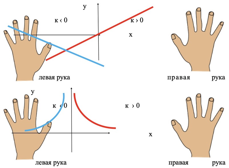 Функция y=kx. Одной из особенностей является прохождение графика через начало координат, точку с координатами (0;0). Это учащиеся запоминают хорошо! Следующее, коэффициент- k и число - b. Коэффициент k указывает нам на возрастание или убывание функции. Здесь у учащихся возникают проблемы: многие думают, что как я прочерчу линию, так она и получится: «снизу-вверх» – значит, возрастает, а если «сверху-вниз» – значит, убывает. Но каждому ребенку удобно чертить ее по-своему. Вот и получается путаница и недопонимание. Об изменении значения аргумента и функции здесь речи не идет! Я предлагаю учащимся такой способ определения знака коэффициента, возрастания или убывания функции, как «ладошки». Рассматриваем только ту часть графика, которая располагается в 1 и 2 четвертях. Нужно положить свои ладошки около них: левая рука около 2 четверти, а правая – около 1 четверти. Далее посмотреть, в какую руку упирается линия графика. Если в правую, то график положительный, если в левую, то отрицательный. Коэффициент k предлагаю назвать k - «куда». Куда упирается график, такое и занчение имеет коэффициент k. Следовательно, k ›0 или k ‹ 0 . Этот метод можно рассмотреть при изучении графика функции у=k/x, когда одна из ветвей графика располагается в 1 или 2 четверти и находится около правой или левой руки. Используя такой метод, учащиеся быстро запоминают направление и расположение графика.