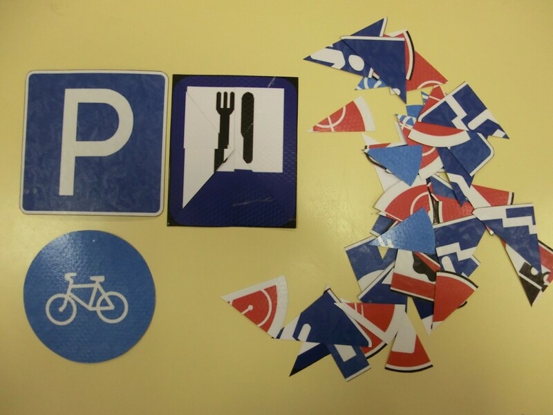 Игра состоит из разрезных картинок, из которых необходимо собрать целую картинку с изображением дорожного знака.