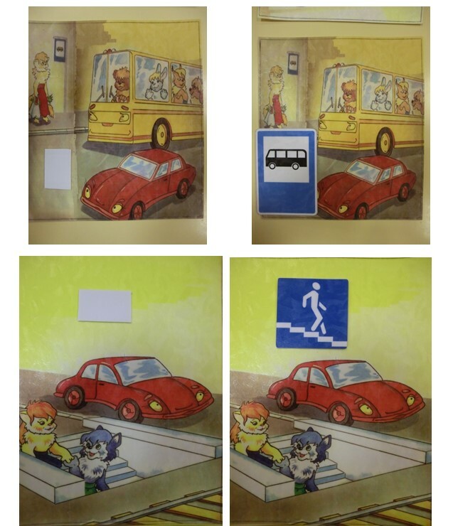 Игра состоит из больших карт с пустыми «окошечками» для постановки дорожного знака и маленьких карточек с изображением дорожного знака.
